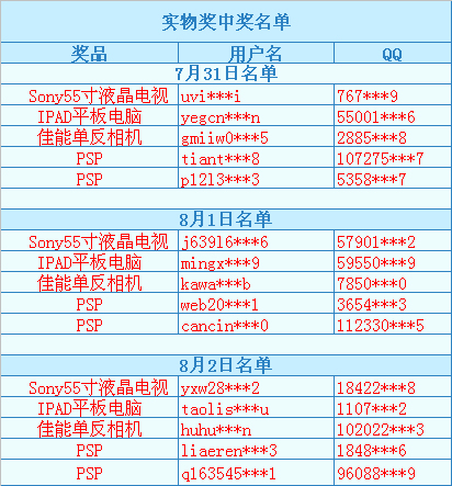 2.中了实物奖的玩家请及时联系官方的工作人员(24小时客服电话:0755-26734415),官方人员在核实您的信息后给予发奖,兑奖截止日期:8月30日。