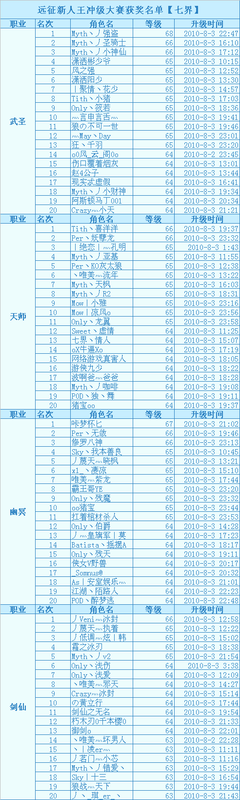 2、四大职业职业等级排名前2~10名的每位玩家将会获得10000绑定金币;
