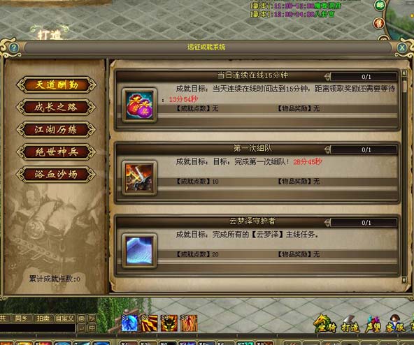 是综合记录玩家在游戏中各种行为,并且对玩家的行为结果给予成就点数与额外奖励的系统。点击“成就系统图标”或按快捷键“Y”打开成就系统。新成就系统共分五类成就:天道酬勤、成长之路、江湖历练、绝世神兵、浴血沙场。更多成就任务、更丰富的奖励。新成就系统无须领取成就相关任务,达到成就目标要求的条件时,自动完成,点击相应成就的“领取奖励”,即可获得该成就的奖励。