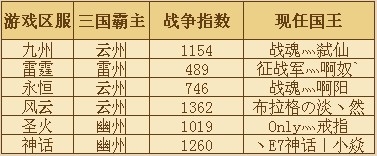 为了庆祝公测六大新区同步开启的活动“乱世鏖战,三国霸主”业已圆满结束,现在公布【九州】,【雷霆】,【永恒】,【风云】,【圣火】,【神话】各大区三国霸主的名单: