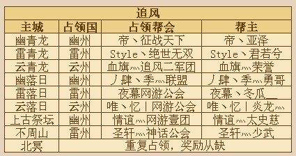 主城首down,争当FD。十大大城池,十个城主名额,数百个帮会联盟,上万远征英雄同时在线激烈捉对厮杀。或是占领本国城市,或是带领兄弟跨国界攻击,实力与血勇的殊死拼杀,智慧与谋略的完美结合,唯有大智大勇者,才能够登上城主之位,成为争霸天下的豪强!现在公布【追风】,【逐日】,【彩虹】 名列“主城首down,争当FD”获奖名单帮派及帮主名单: