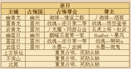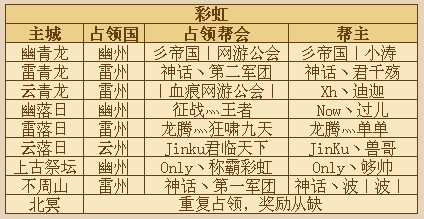 3.每个帮派占领第一个主城才能获得奖励。如果同一个帮派在占领第一个主城确定奖励名额后,又成功占领其他的主城,那么此主城的奖励从缺。