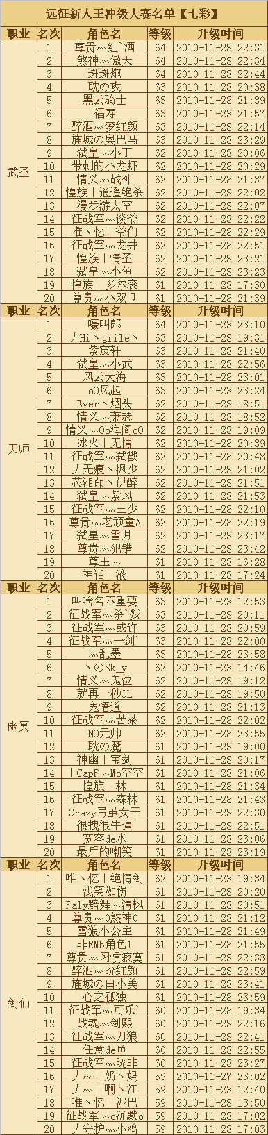 2、四大职业职业等级排名前2~10名的每位玩家将会获得10000绑定金币;