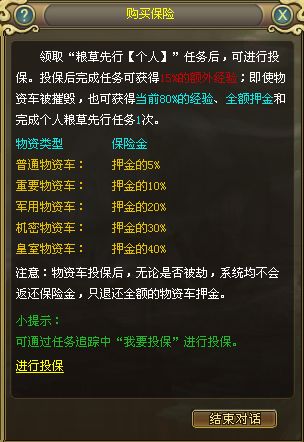 2.镖车血量为100%时(未受到攻击)且未交付运镖任务前,皆可随时购买保险;