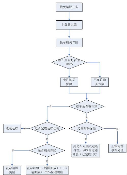 玩家接取镖车时,由系统提示是否购买运镖保险,运镖保险金数额与所保镖车品质、镖车押金有关。购买保险后,完成运镖时,可获得额外15%的经验加成。如果购买保险后车辆被砸毁,则系统退还所有的运镖押金。