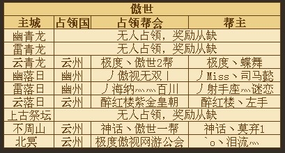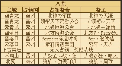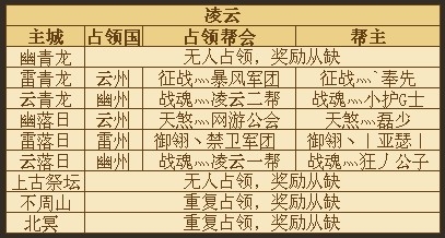 3.每个帮派占领第一个主城才能获得奖励。如果同一个帮派在占领第一个主城确定奖励名额后,又成功占领其他的主城,那么此主城的奖励从缺。