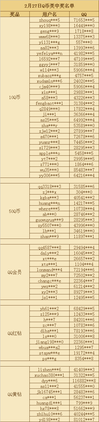 2月25日~2月27日“百万豪礼 100%有”活动中奖名单