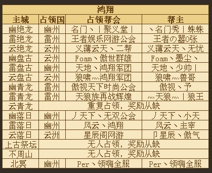 活动规则:1.新开区服,每个区服首次占领十五大主城其中之一的第一个帮派将会获得奖励。占领不同的主城获得奖励不同,占领中立区上古祭坛、不周山、北冥以及本国攻占敌国主城奖励要高一些。 2.城主战时间:周一绝龙岭、周二盘古岭、周三青龙城,落日城、周四上古祭坛,不周山、周六北冥,战斗时间为7点半到8点半。 3.每个帮派占领第一个主城才能获得奖励。如果同一个帮派在占领第一个主城确定奖励名额后,又成功占领其他的主城,那么此主城的奖励从缺。 4.每个帮派只能占领一个领地,如果抢占新的领地成功后,本帮会旧领地自动恢复成无人占领状态。 5.成功占领各大主城的帮派,官方将记录下来,十五大主城都被成功占领后官方将公布奖励获奖名单并发放奖励。