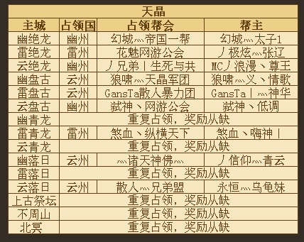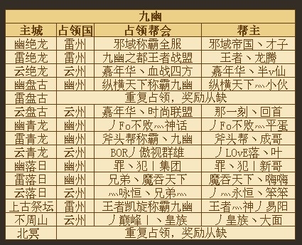 活动规则:1.新开区服,每个区服首次占领十五大主城其中之一的第一个帮派将会获得奖励。占领不同的主城获得奖励不同,占领中立区上古祭坛、不周山、北冥以及本国攻占敌国主城奖励要高一些。 2.城主战时间:周一绝龙岭、周二盘古岭、周三青龙城,落日城、周四上古祭坛,不周山、周六北冥,战斗时间为7点半到8点半。 3.每个帮派占领第一个主城才能获得奖励。如果同一个帮派在占领第一个主城确定奖励名额后,又成功占领其他的主城,那么此主城的奖励从缺。 4.每个帮派只能占领一个领地,如果抢占新的领地成功后,本帮会旧领地自动恢复成无人占领状态。 5.成功占领各大主城的帮派,官方将记录下来,十五大主城都被成功占领后官方将公布奖励获奖名单并发放奖励。