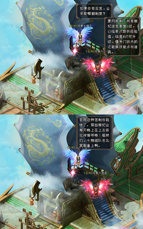 玩家与他家媳妇的对话,老婆问道:如果你有后宫,会采取哪朝制度?玩家:说要网游制,所有嫔妃进宫都算1级,以临幸次数折经验值,临幸N次可升级,懂专门技术的还能换技能点与道具。YY了一通后,媳妇说:若用这种宫制你就惨了。那些嫔妃会每天晚上在上古祭坛深情呼唤:姐妹们,今晚组队去北冥刷皇上啊。