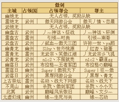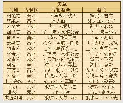 活动规则:1.新开区服,每个区服首次占领十五大主城其中之一的第一个帮派将会获得奖励。占领不同的主城获得奖励不同,占领中立区上古祭坛、不周山、北冥以及本国攻占敌国主城奖励要高一些。 2.城主战时间:周一绝龙岭、周二盘古岭、周三青龙城,落日城、周四上古祭坛,不周山、周六北冥,战斗时间为7点半到8点半。 3.每个帮派占领第一个主城才能获得奖励。如果同一个帮派在占领第一个主城确定奖励名额后,又成功占领其他的主城,那么此主城的奖励从缺。 4.每个帮派只能占领一个领地,如果抢占新的领地成功后,本帮会旧领地自动恢复成无人占领状态。 5.成功占领各大主城的帮派,官方将记录下来,十五大主城都被成功占领后官方将公布奖励获奖名单并发放奖励。