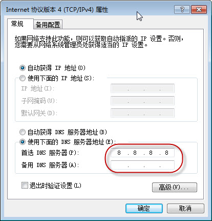 6.在属性设置界面中点选“使用下面的DNS服务器地址”,并将首选DNS服务器地址设置为8.8.8.8,然后点击确认。