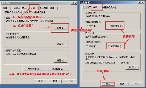 对第一种情况的解决方法可以参考无法连接服务器的解决方法;第二种情况则多数是由于玩家使用的电脑配置较低造成的。如果电脑内存在1G以内,可以按照下图所示方法对系统进行优化。(操作完成需要重启电脑才生效):