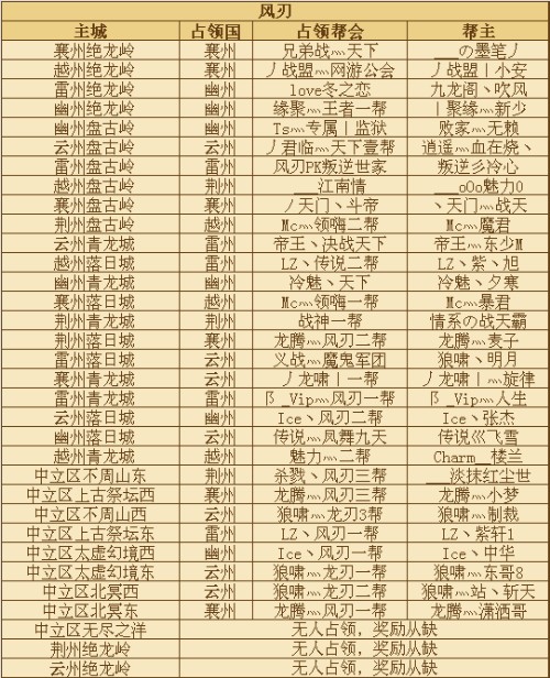 六国主城首down,争当FD。三十三大城池,三十三个城主名额,数百个帮会联盟,上万远征英雄同时在线激烈捉对厮杀。或是占领本国城市,或是带领兄弟跨国界攻击,实力与血勇的殊死拼杀,智慧与谋略的完美结合,唯有大智大勇者,才能够登上城主之位,成为争霸天下的豪强!现在公布【风刃】名列“主城首down,争当FD”获奖名单帮派及帮主名单: