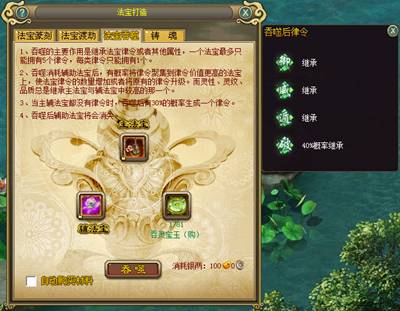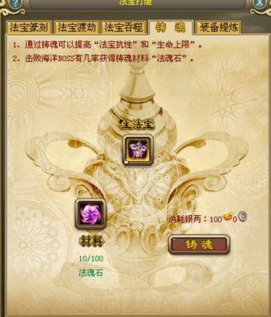 法宝打造的最后一步是法宝铸魂,通过铸魂可以大幅提高法宝的抗性和生命上限,这一点提升可以在玩家与同为法宝玩家的PK中规避更多的法宝伤害,提高法宝的生存能力,造成更多的伤害输出。