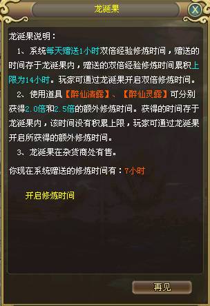 充值增加修炼时间 除了系统赠送给玩家的双倍修炼时间,玩家还可以在商城中购买一些道具增加龙涎果的修炼时间。使用充值道具增加的双倍修炼时间没有上限限制,并且越是珍贵的道具,增加的倍数越多,最高可增加3.0倍。可用于增加双倍修炼时间的道具有:
